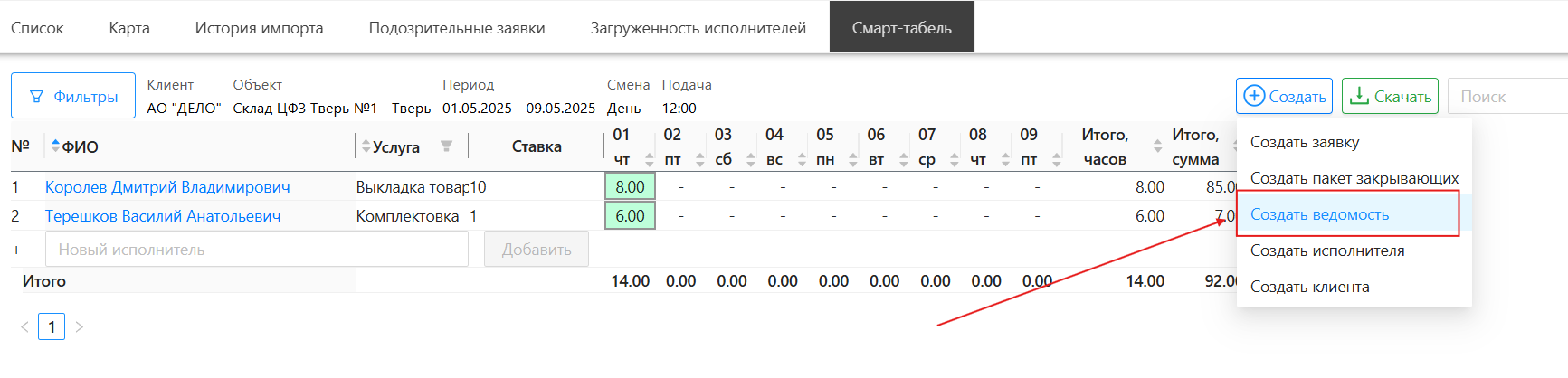 📌 Зачем это нужно: Ведомость — список выполненных услуг за период, показывающий суммы вознаграждения исполнителям. Создание ведомости готовит данные для расчетов