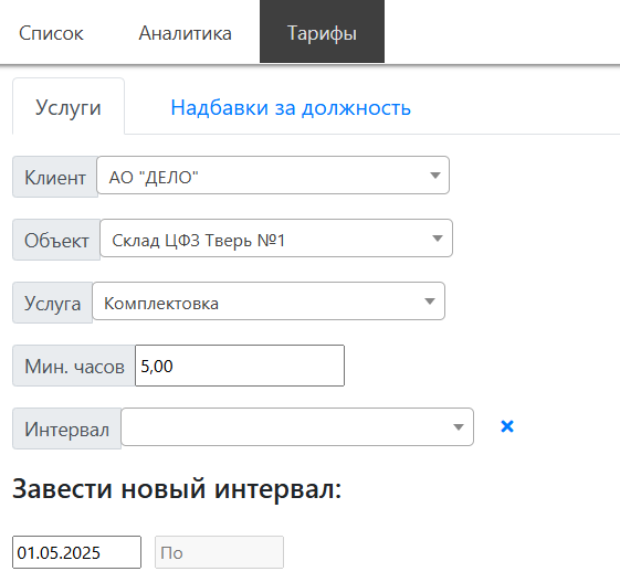 Примечание: Нельзя иметь два интервала с датой "н.в." одновременно. Если текущий интервал, например, 01.01.2025 – н.в. (как показано на скриншоте), создайте новый интервал, начиная с 03.06.2025. После этого текущий станет 01.01.2025 – 02.06.2025, а новый будет 03.06.2025 – н.в.