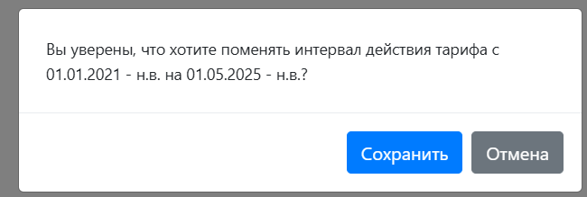 Интервалы определяют период действия тарифов. Тарифы не могут пересекаться. Если текущий интервал, например, 01.01.2020 – н.в., а вы создаете новый интервал с 01.02.2020, то:
