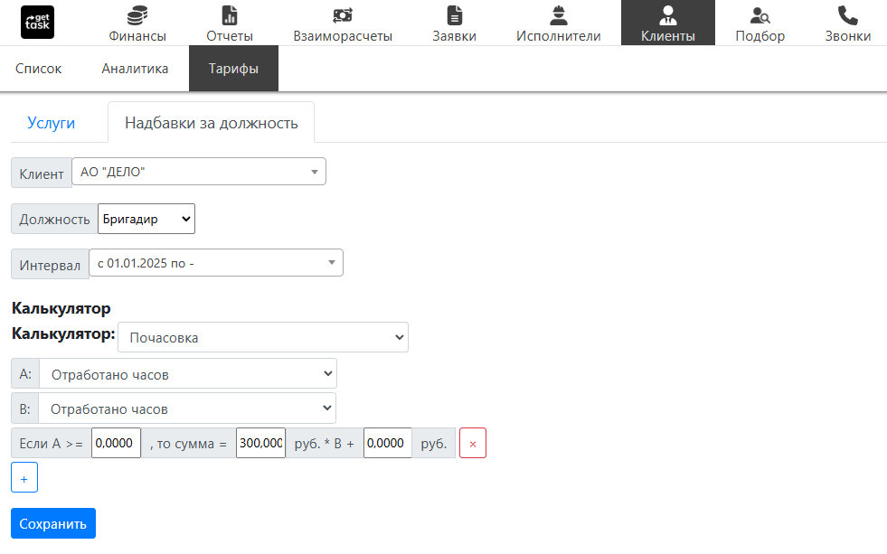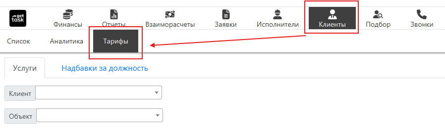 📌 Зачем это нужно: Тарифы определяют стоимость услуг для клиентов и размер вознаграждения для исполнителей. Правильная настройка обеспечивает точные расчеты в системе и помогает поддерживать порядок в финансовых данных.
