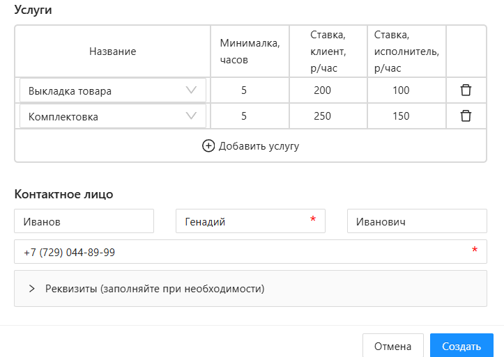 Добавляются вручную к каждому объекту. Включают: название, минимальные часы, ставка для клиента и исполнителя. |