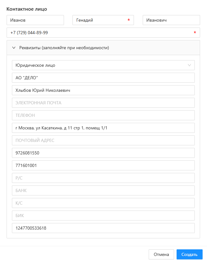 4. После нажатия кнопки Создать, система автоматически откроет страницу нового Клиента