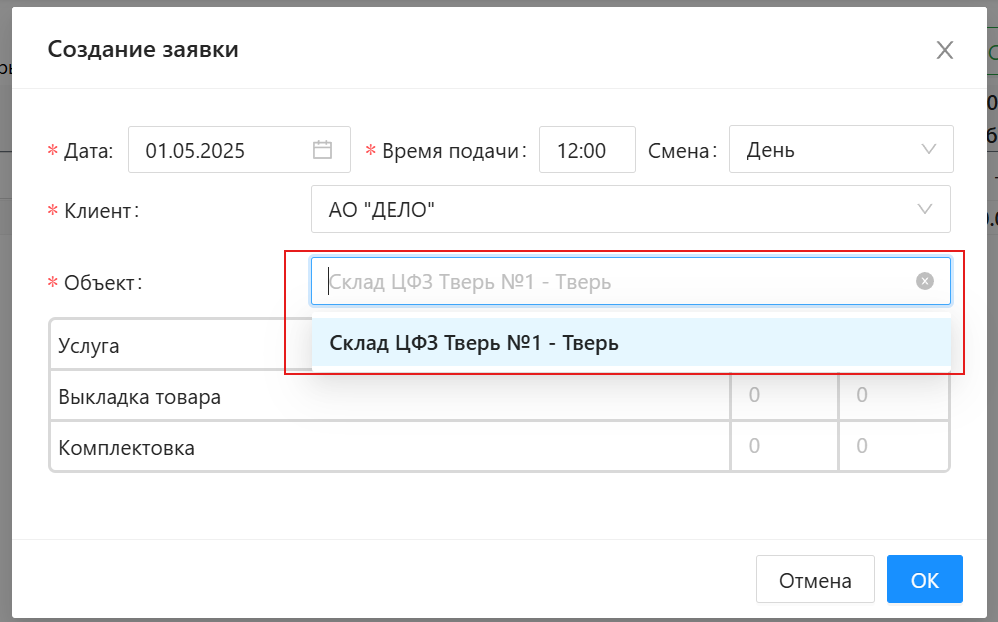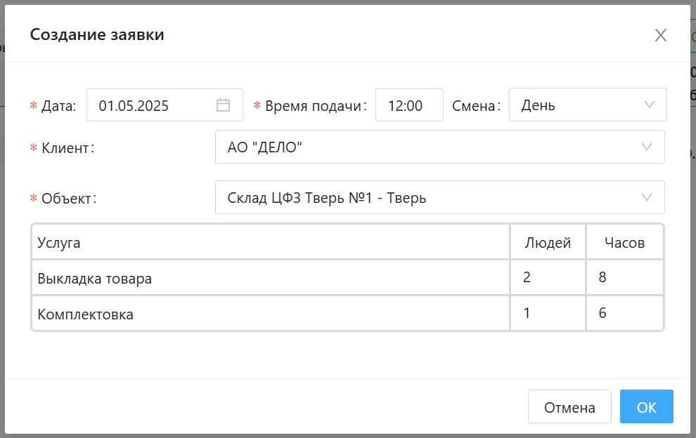 При выборе объекта система автоматически подтягивает связанные с ним услуги, количество людей и минимальное количество часов, заданные в настройках объекта. Если у клиента один объект, он выбирается автоматически; если несколько — выберите нужный из списка. Это упрощает создание заявки, исключая ручной ввод данных. ![]() |