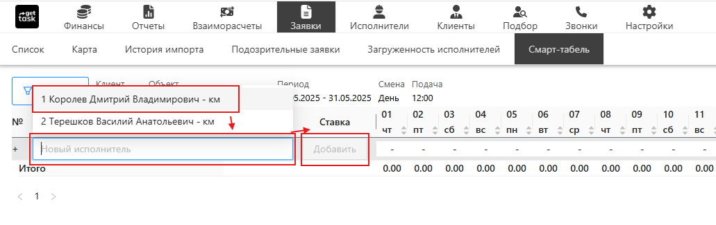 2. В смарт-табеле найдите ячейку с созданной заявкой и нажмите «Добавить»