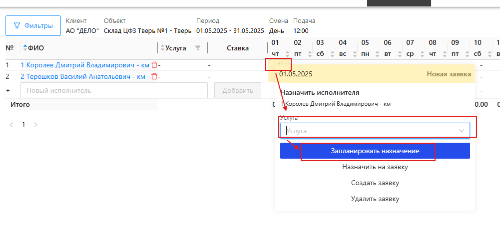 📌 Зачем это нужно: Массовые действия ускоряют работу с несколькими заявками, например, при планировании на неделю или назначении большого количества исполнителей сразу на период.
