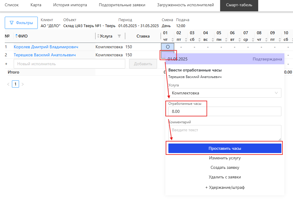 4. Нажмите «ОК». Заявка появится в таблице смарт-табеля на выбранную дату.