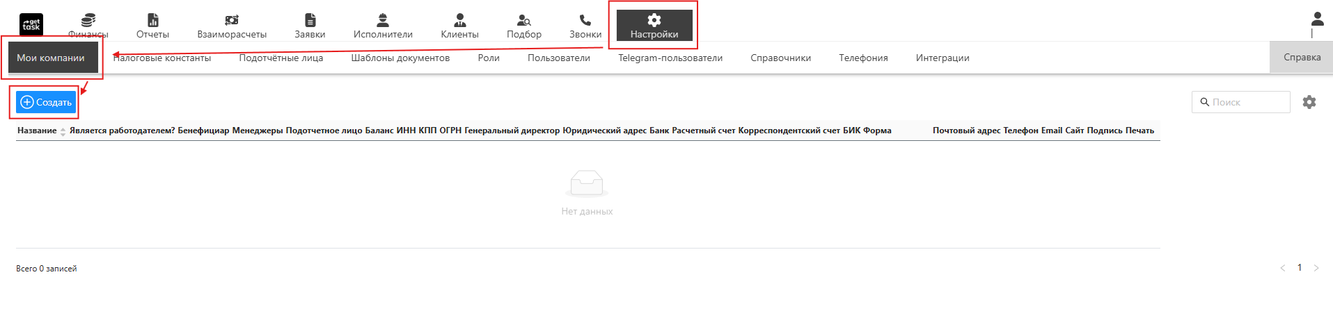 📌 Зачем это нужно: Компания — это юридическое лицо, от имени которого осуществляется взаимодействие с клиентами, оформляются договоры, создаются заявки и проводятся расчеты. Без создания компании невозможно полноценное использование системы.