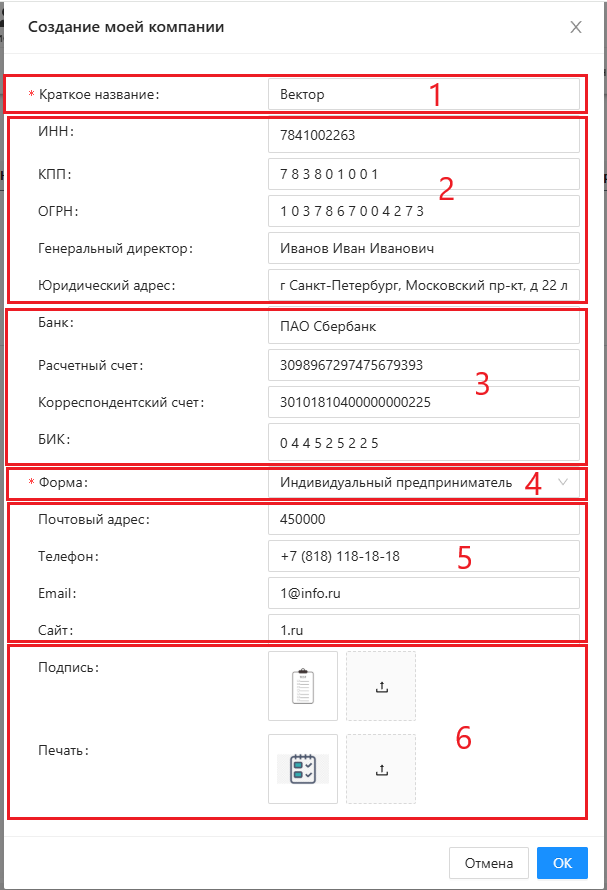 | 5. E-mail, сайт | Контактные данные компании, которые отображаются в системе для связи и дополнительной информации. |
