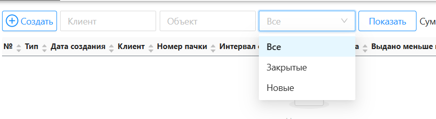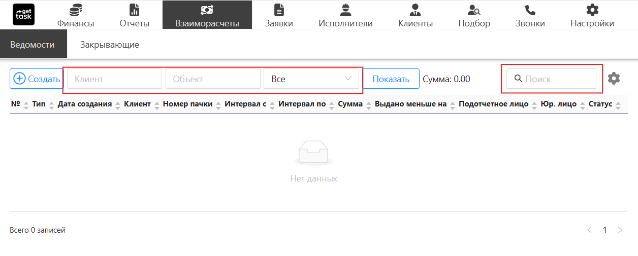 | Статус | Фильтр по статусу ведомости: Все, Новые, Закрытые. | См. таблицу статусов ниже. |