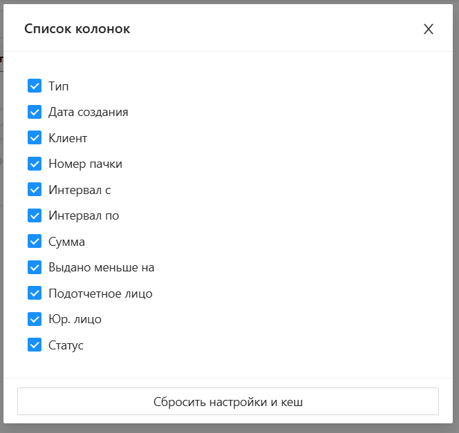 | Шестеренка | Позволяет изменить количество отображаемых столбцов в таблице |