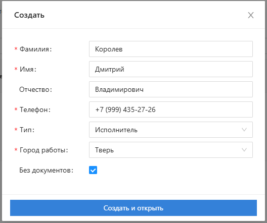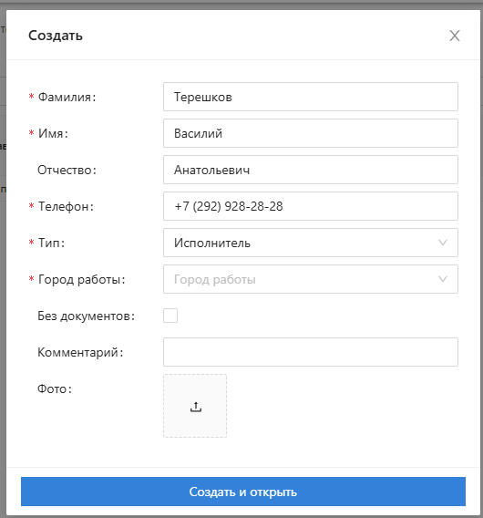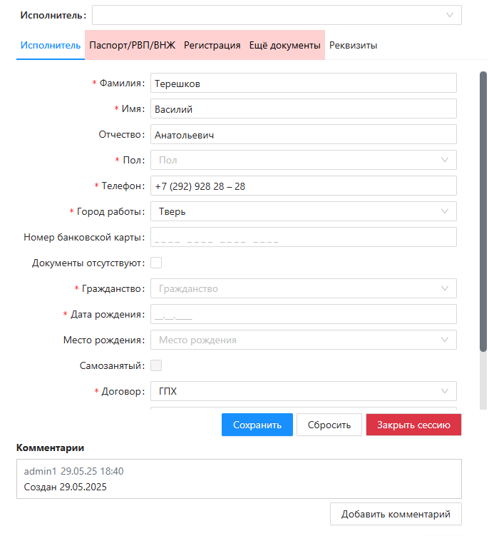 2. После инициации функциональной кнопки “Создать и закрыть” система автоматически открывает страницу сессии создания исполнителя: